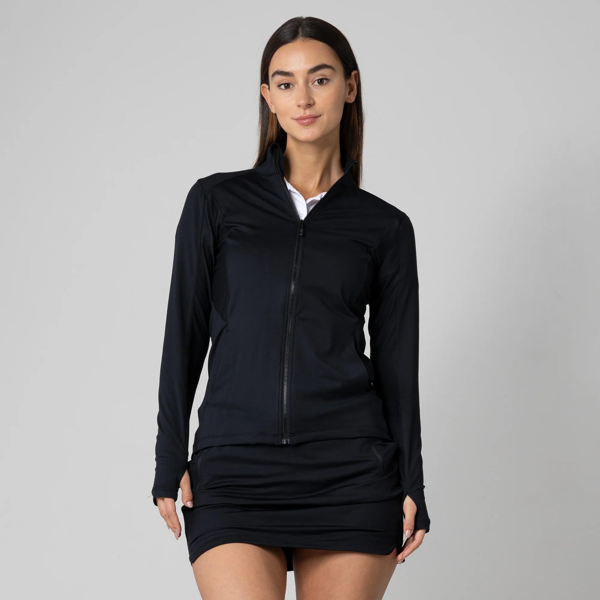 Meet the Alyssa midlayer, a versatile full-zip jacket designed for both golf enthusiasts and leisure activities. Made from a blend of 88% polyester and 12% spandex, this knit fabric jacket ensures wearability and flexibility. Key features include inner arm ventilation to keep you cool, front pockets for convenience, and a mock neck for added warmth. The raglan sleeves facilitate a better range of motion, ideal for perfecting your golf swing or enjoying a day out. Additionally, thumb holes keep the sleeves in place and hands warm, while the drop tail provides extra coverage. Whether you're hitting the links or taking it easy, the Alyssa midlayer will be your new go-to. This has the Glasgow Hills 25th Anniversary logo on the left sleeve.